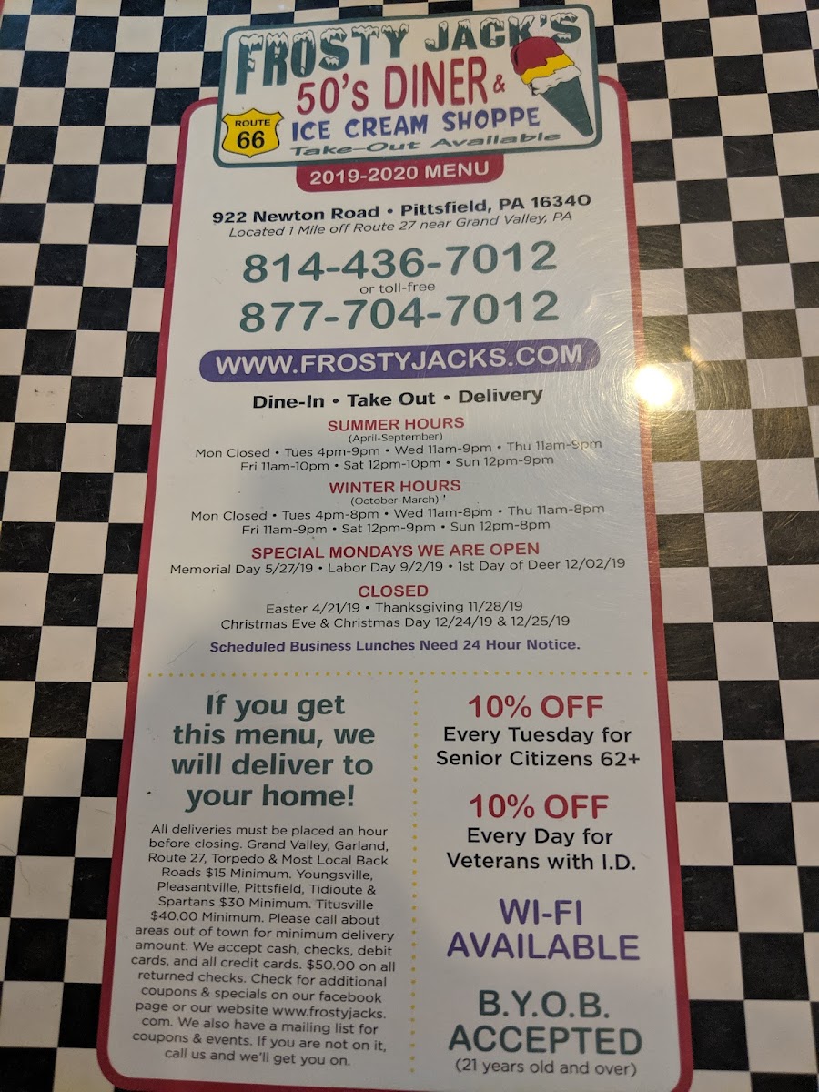 Welcome to Frosty Jacks, a hidden gem nestled at 922 Newton Sanford Rd in Pittsfield, PA. This unique eatery offers an eclectic menu that caters to a variety of cravings. From their indulgent Peanut Butter Cup ice cream to the refreshing Roadrunner Raspberry, there's something for everyone, making it a delightful stop.